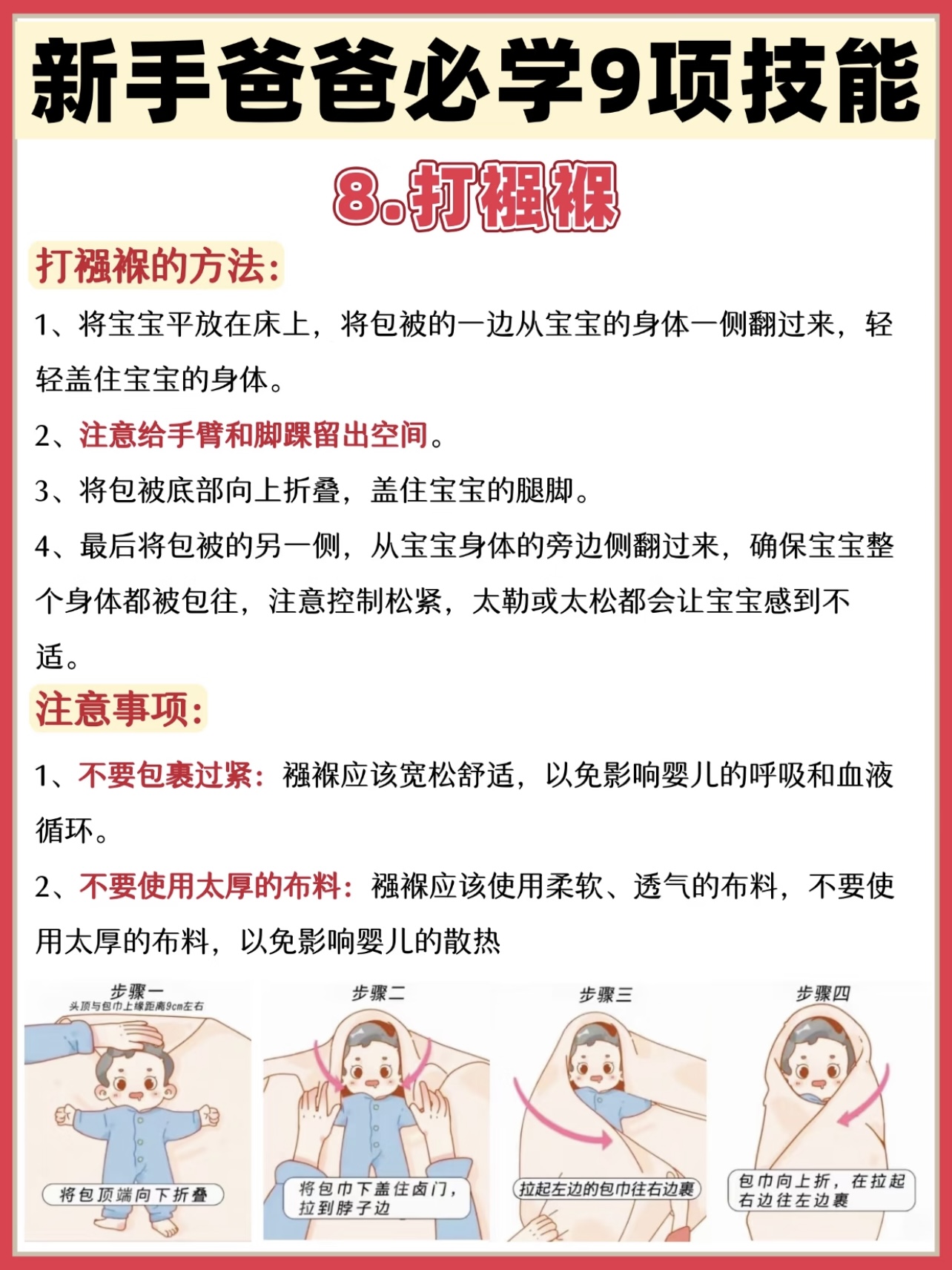 打襁褓:将宝宝平放在床上,将包被的一边从宝宝的身体一侧翻过来,将包被底部向上折叠,盖住宝宝的腿脚,最后将包被的另一侧,从宝宝身体的旁边侧翻过来,确保宝宝整个身体都被包往。