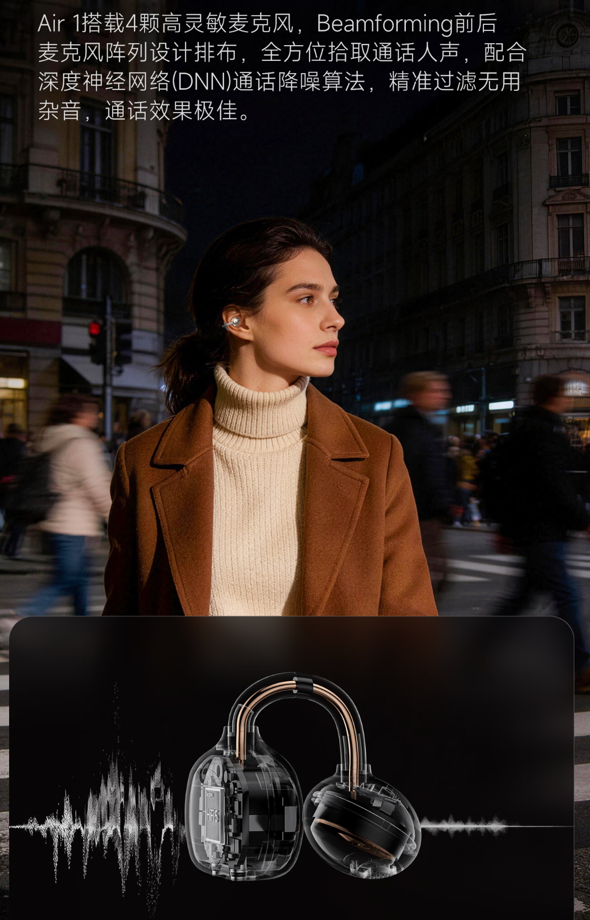l音质痛点:开放式设计通过定向传音与逆向声波抵消技术降低漏音,结合高解析振膜与丹麦专业调音,打破“开放式耳机无音质”的刻板印象。
