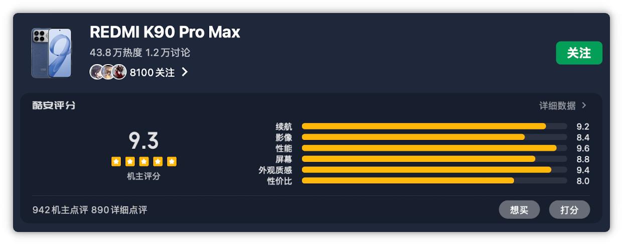 而且从用户的评价来看,红米K90 Pro Max的口碑表现还算不错,在酷安机主的评分中获得了9.3分的成绩,这个成绩没有落后于友商的竞品,也比前代的K80 Pro得分要强,对于这个表现还是有点让人感觉意外的,毕竟米系手机这几年在网上被喷的有点惨。