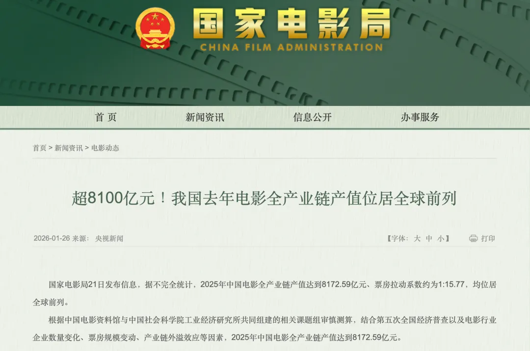 国家电影局21日发布数据显示,中国电影2025年全产业链产值达到8172.59亿元、票房拉动系数约为1:15.77,两项指标均位居全球前列。这份亮眼成绩单,不仅印证了中国电影产业的强劲发展活力,更标志着行业正从单一票房经济向多元化消费生态转型,为经济发展打开全新增长空间。