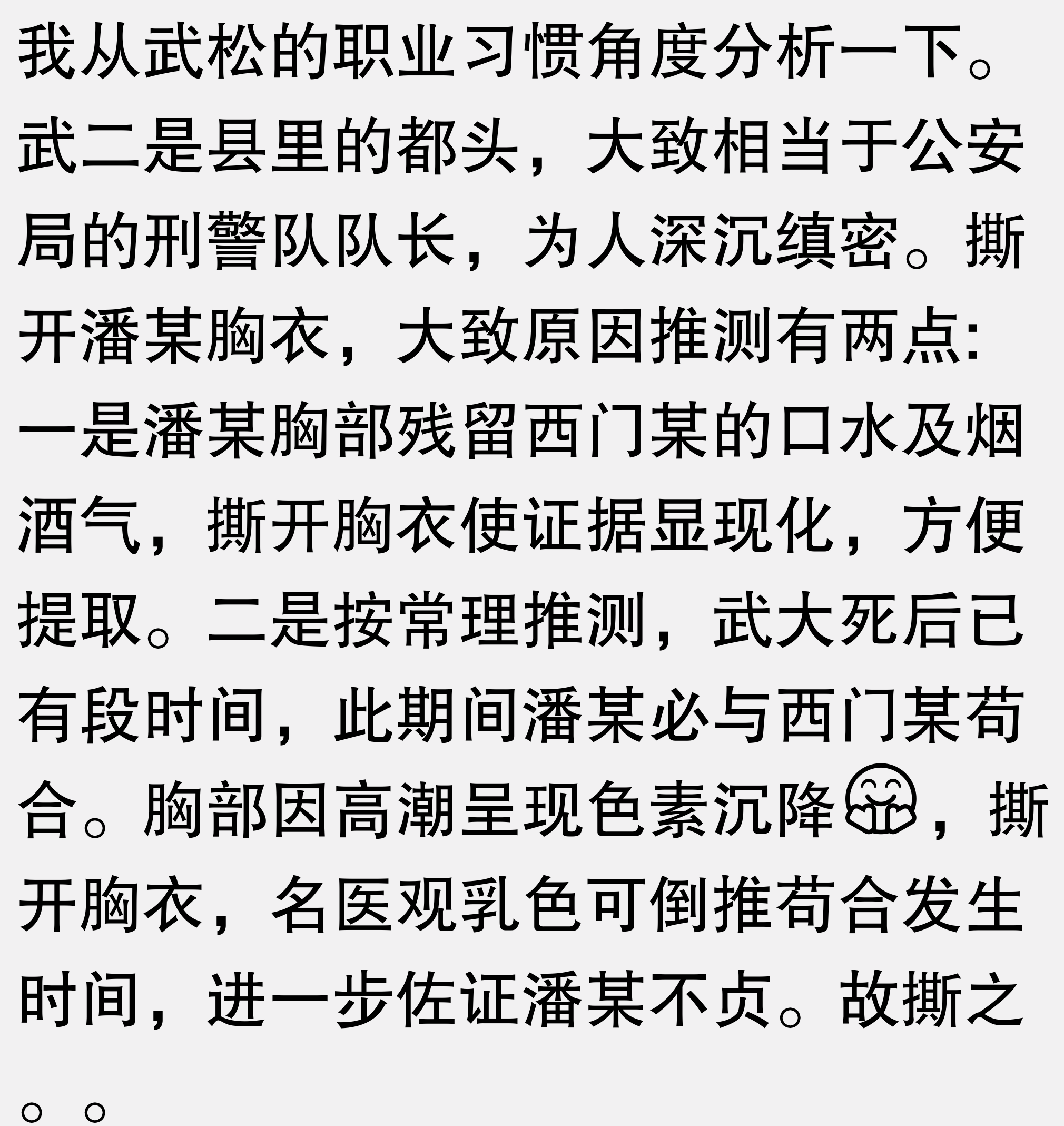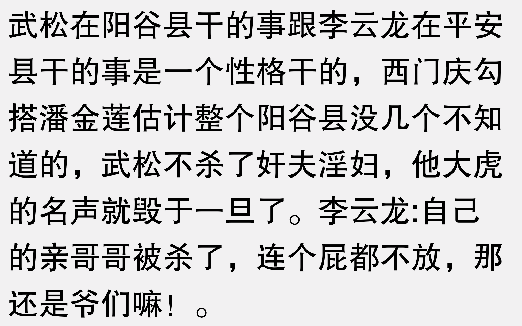 看过一个说法,说施先生肯定是刑狱的高手,还有就是水浒传里的武松很厉害,金瓶梅里面的很菜,还有就是其实正是武松间接害死了武大,因为给了他不该有的希望,没有武二的时候武大知道隐忍,但是有了武二后武大觉得自己有人撑腰了,所以敢跟奸夫淫妇硬拼,结果把自己拼没了