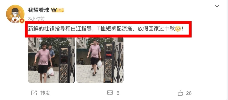 徐杰近期因感染带状疱疹病毒缺席了在汕头的热身赛,但从网友分享的照片中可以看到后卫徐杰的身影,徐杰在广东宏远宿舍门口出没,他一个人就领取了整整三盒月饼,十分接地气,都知道徐杰是大好人一枚,显然是帮未到场的队友代领了,而另一位队友王少杰则领取了一盒,拥有21万粉丝的广东篮球媒体人@我耀看球 也是分享了部分照片,看到主教练杜锋与白江指导也身着粉色T恤短裤配凉拖的休闲装扮现身宿舍门口,似乎也已准备开启自己的假期,相信也是近期拍摄的照片。