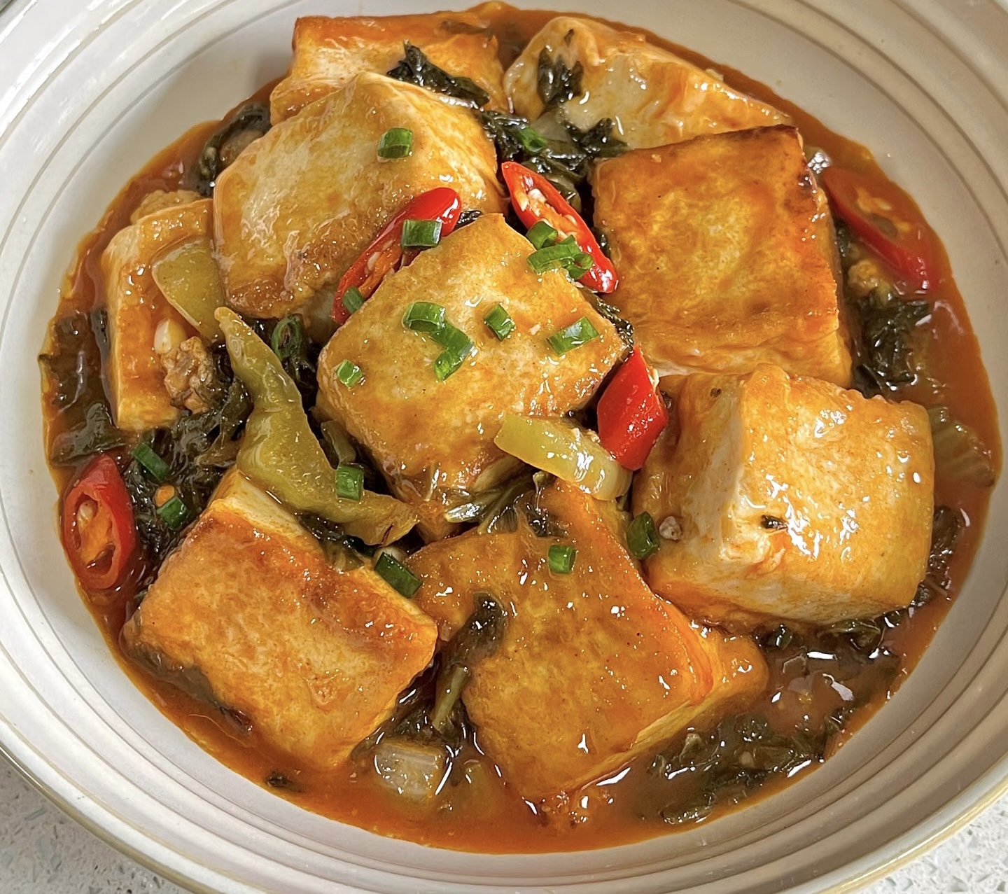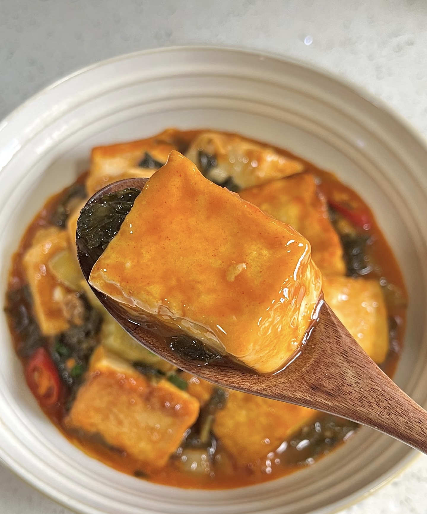 5.放入豆腐:将沥干水分的豆腐块轻轻放入锅中,注意不要用力翻动,避免豆腐碎裂。保持中小火,盖上锅盖焖煮8-10分钟,让豆腐充分吸收汤汁的味道。