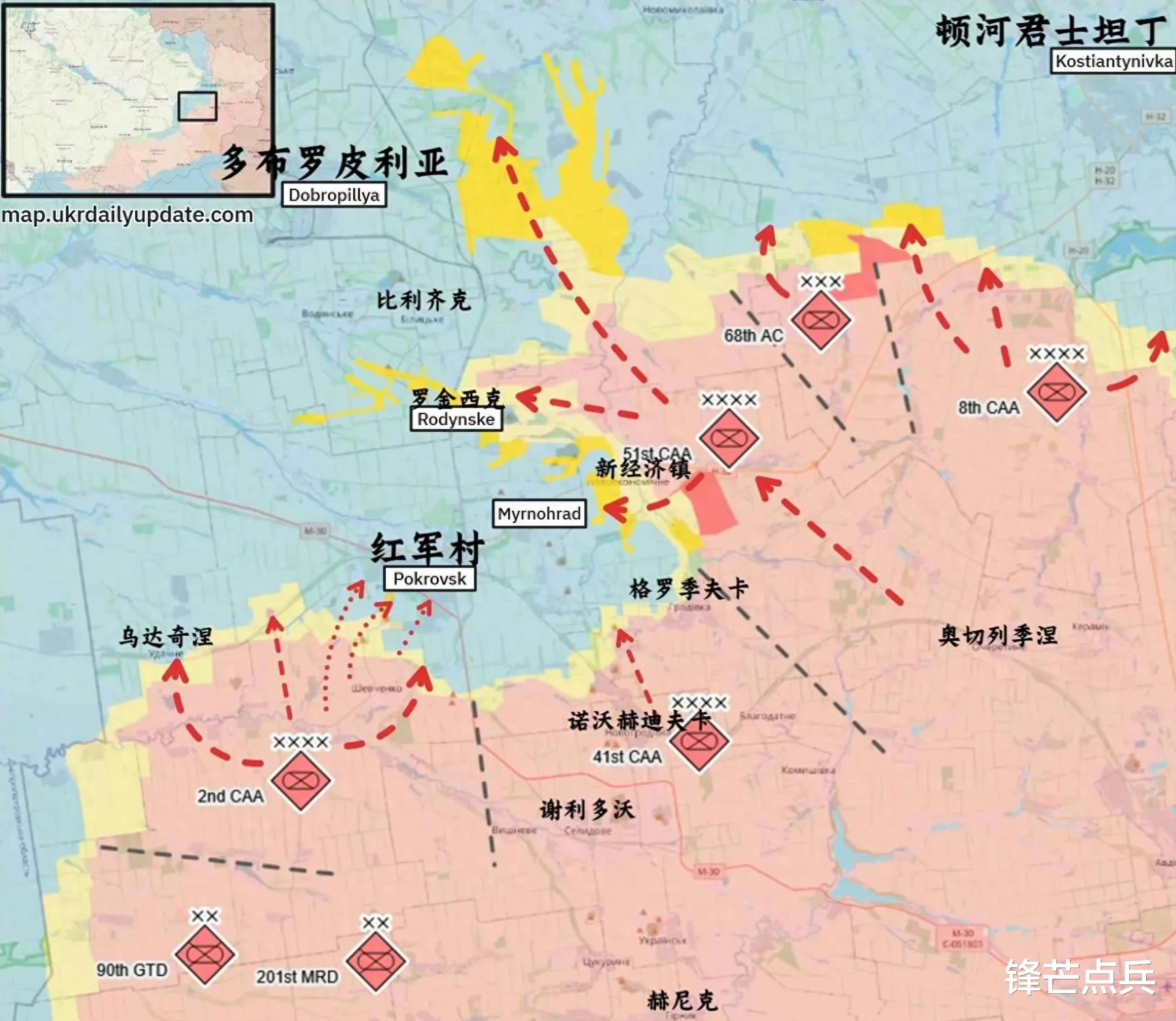 位于红军城以北的罗金西克北部爆发激烈战斗,这是俄军在红军城战场上打出的一个“突出部”,从目前的态势来看,俄军显然是想利用这个“突出部”完成对红军城的全面包围,现在只有红军城的西部方向还没有被俄军控制,如果俄军这个“突出部”巩固下来并且迅速南下,那么位于红军城战线的数万乌军最后的后撤之路就会被堵死。