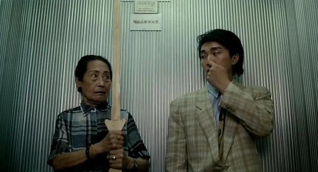 另外值得一提的是电梯间的这位阿婆,饰演她的演员叫钱似莺,是中国第一代武打女星,她也是洪金宝的奶奶。