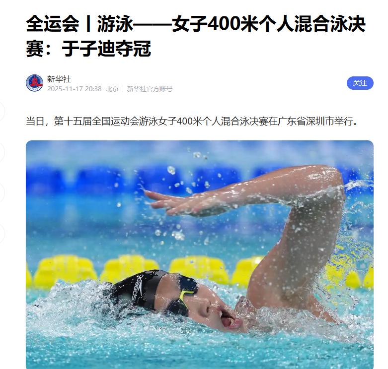全运会丨游泳——女子400米个人混合泳决赛:于子迪夺冠 新华社 2025-11-17 20:38北京新华社官方账号
