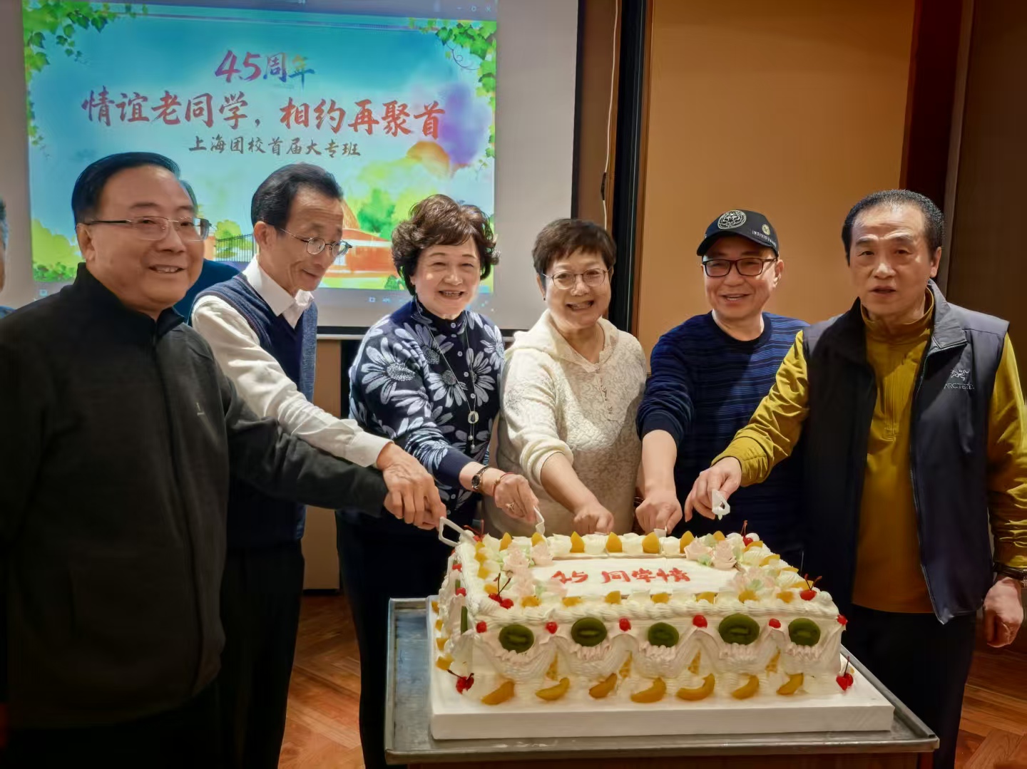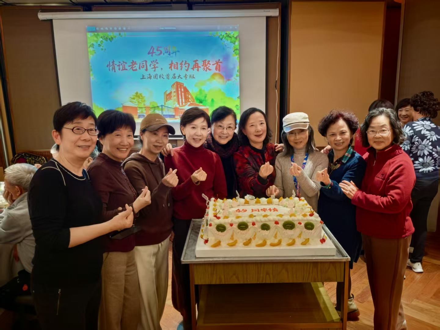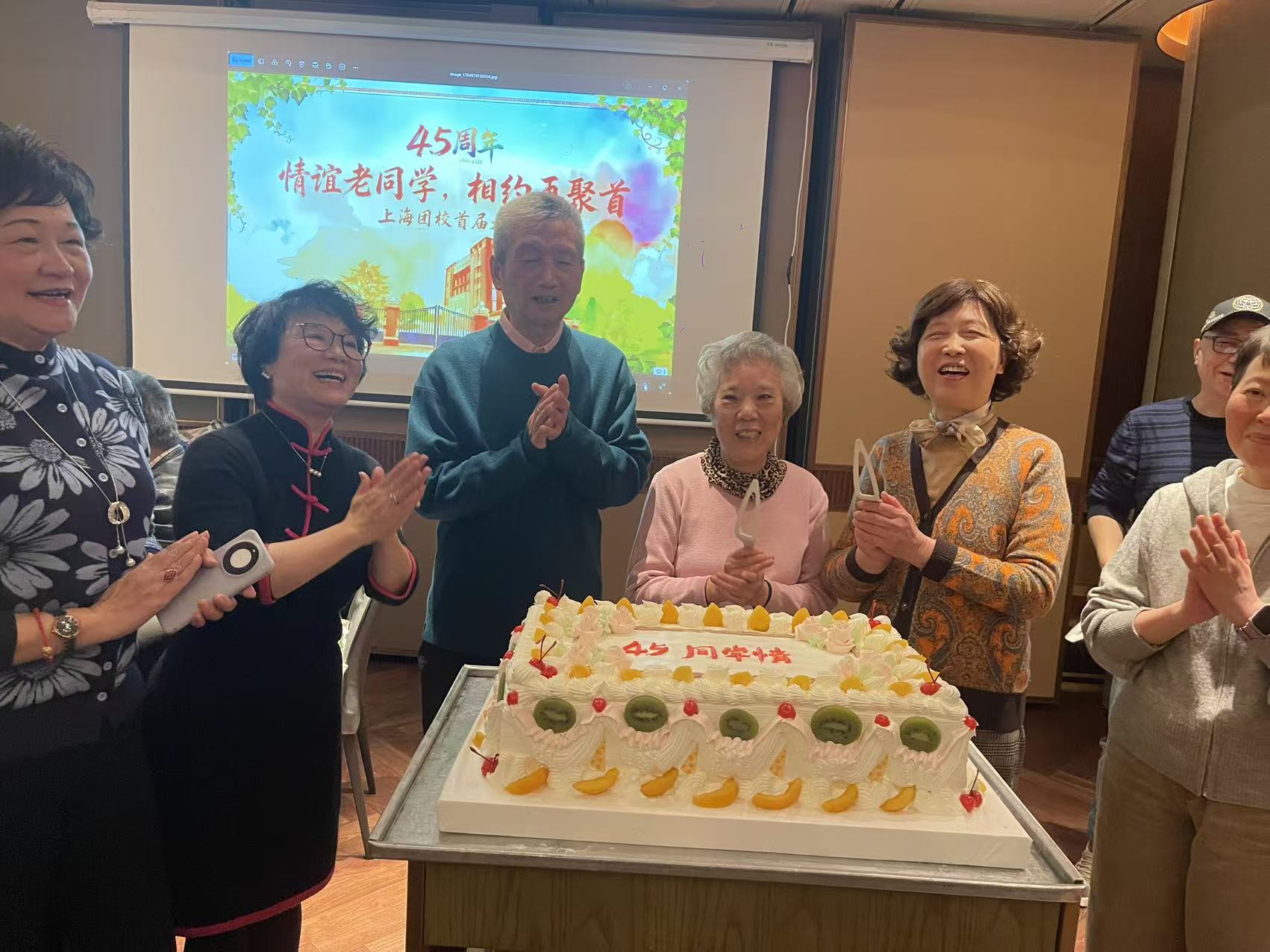 在温馨的气氛中,大家共同切开写有“45岁同学情”的生日蛋糕,齐声高唱《毕业歌》。笑声与歌声交织,泪水与掌声相融。这一刻,我们不仅庆祝45年的深厚情谊,更相约——5年后,在“上海团校首届大专班”50周年大庆时,再聚首,再叙情。