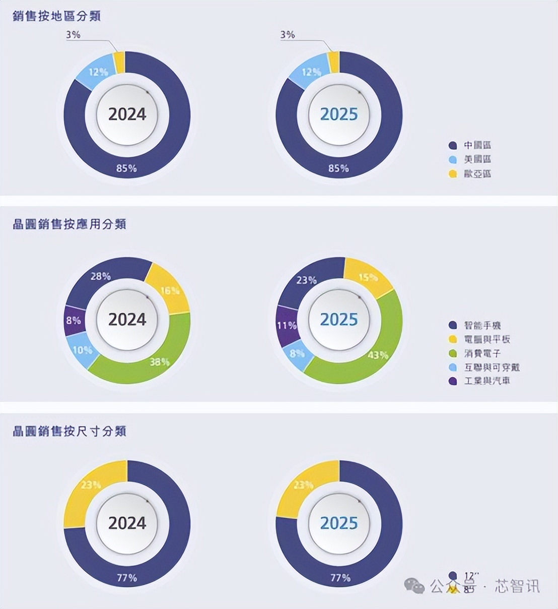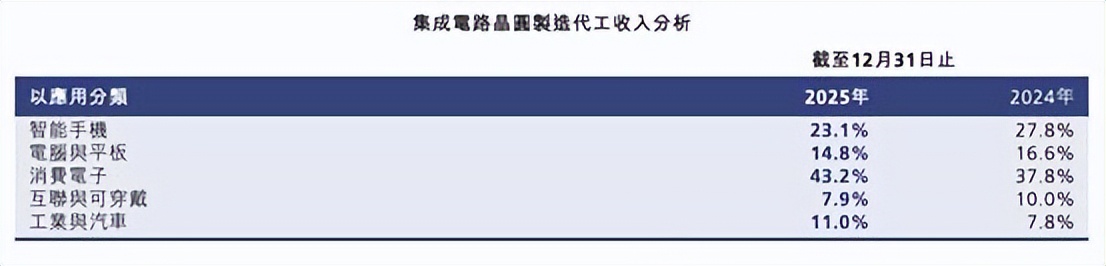 按晶圆应用分类的收入占比分别为:智能手机23%、电脑与平板15%、消费电子43%、互联与可穿戴8%、工业与汽车占比为11%。