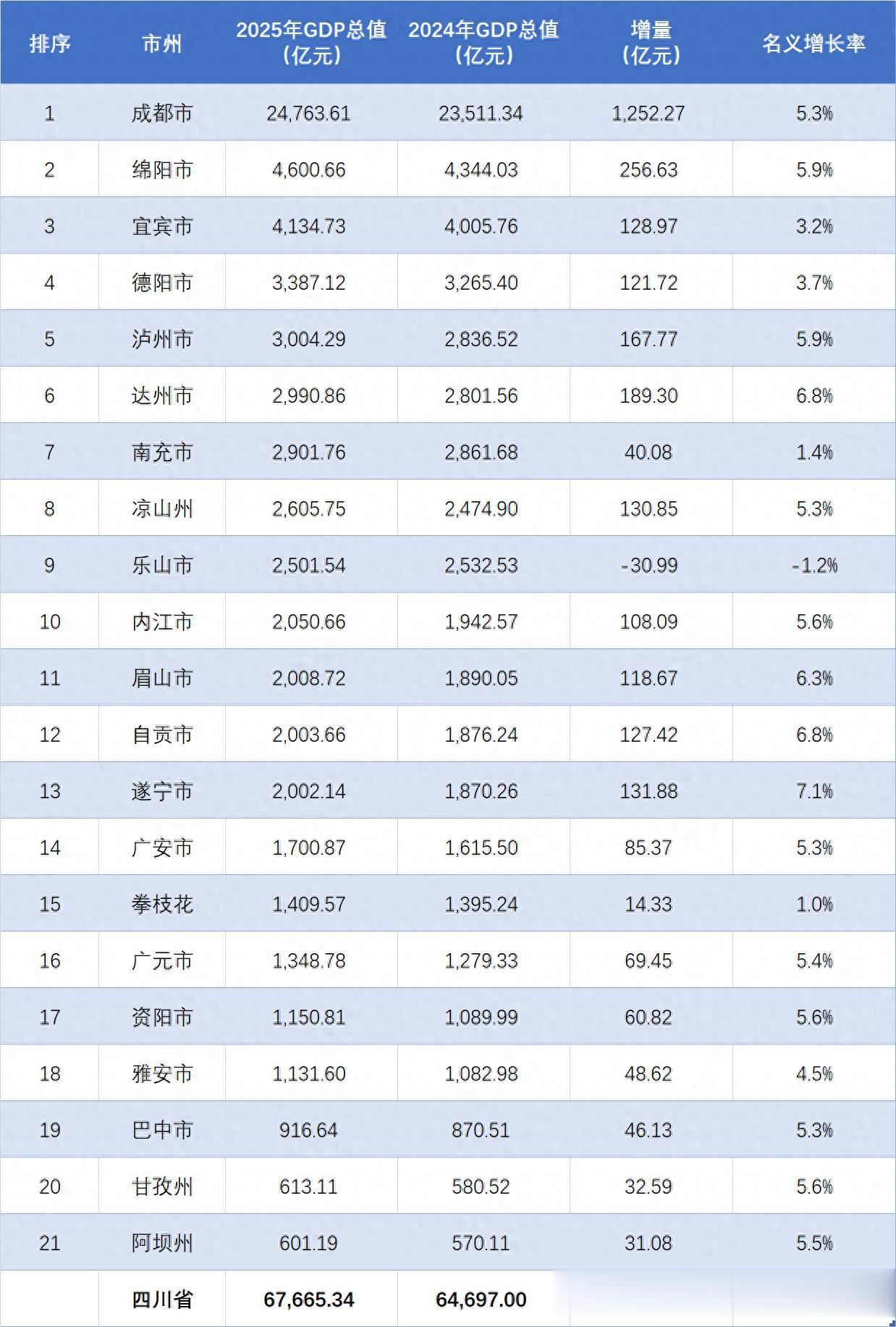 省内市州中,成都市作为全国经济十大城市之列,其经济规模堪称一枝独秀、遥遥领先,2025年全年GDP总值为24763.61亿元,是四川省唯一一个超万亿的城市,稳居全省之首。与上年同期相比,成都市GDP总值实现了5.3%的名义增长,增速高于全省平均,表现较好,期待2026年能够继续保持,争取再创新高。