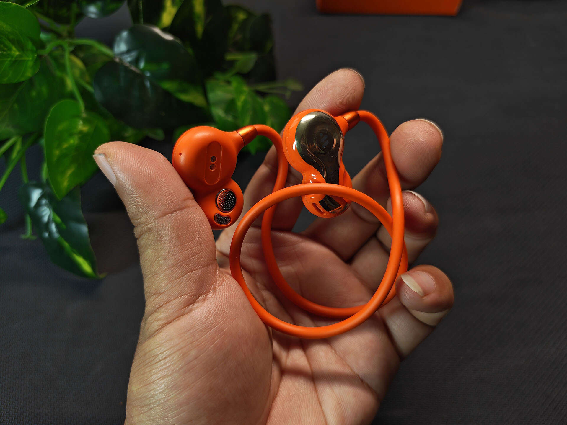 挂脖部分采用 0.9mm 柔韧金钛丝,弯折后能迅速回弹复原,耳挂处的液态硅胶触感细腻,与耳廓接触时无冰冷感。机身侧面的金属拉丝按键极具机械美感,按压反馈清晰,盲操作时能精准识别指令,科技动感与实用性完美融合。