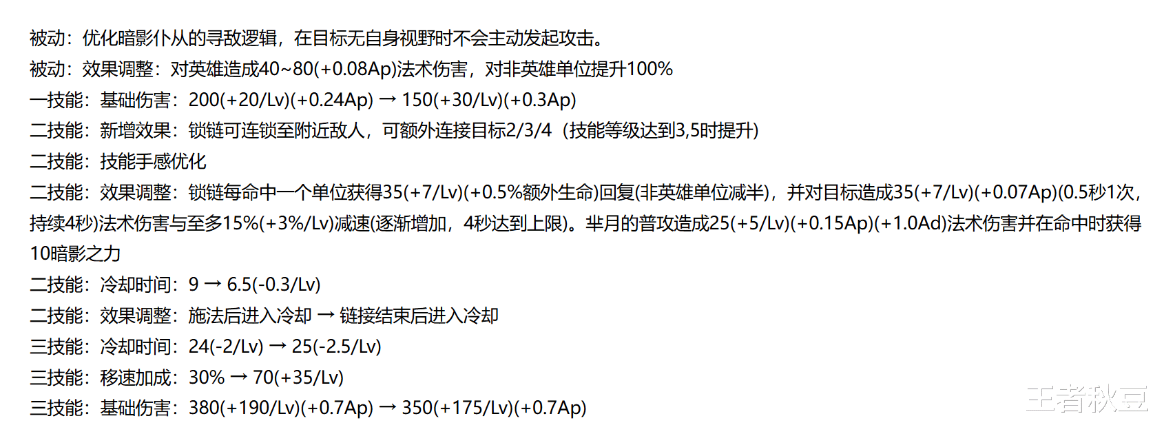 具体的数值和技能变化如上:被动优化,在目标没视野时不会主动发起攻击,还增加了对非英雄单位提升100%的伤害,二技能新增群链机制,二技能命中后仆从会自动搜寻并传导链接给其他未被链接的目标,造成伤害和减速并回复自身生命值,群链至多连接5名敌方单位,团战能力加强。