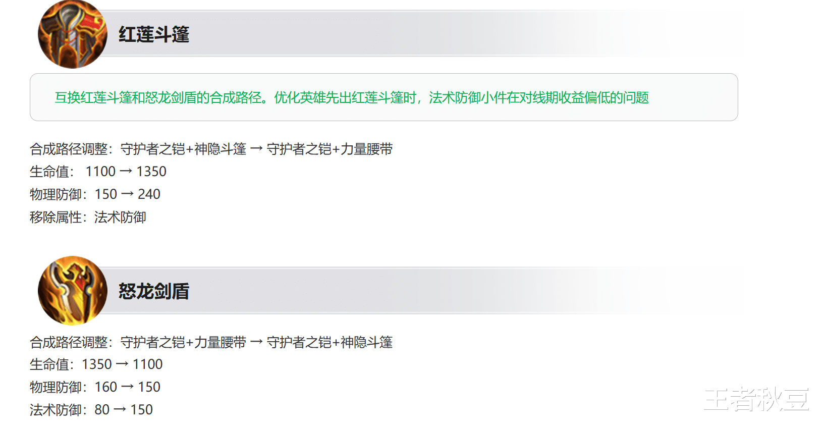 红莲斗篷和怒龙剑盾的合成途径互换,红莲斗篷移除法术防御,物理防御增加90点,高达240的物理防御,生命值提升到1350点。怒龙剑盾生命值降低250点,物理防御降低10点,发育防御提升70点。简单来说,怒龙剑盾的合成途径和属性和原来的红莲斗篷一模一样。