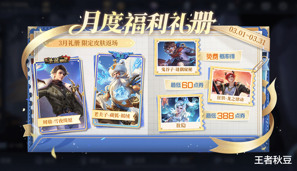 3月1日三月福利礼册上新,周瑜-雪夜绮愿(史诗)、老夫子-藏狐·褐绒(史诗)限时返场,限定皮肤祈愿最低8折,710点券就能购买这两款皮肤其一。每月刷新币会清零,不会自动转换为进度,大家记得清空刷新币。史诗皮肤奖励则会保留次数,可以刷新出史诗皮肤为止。