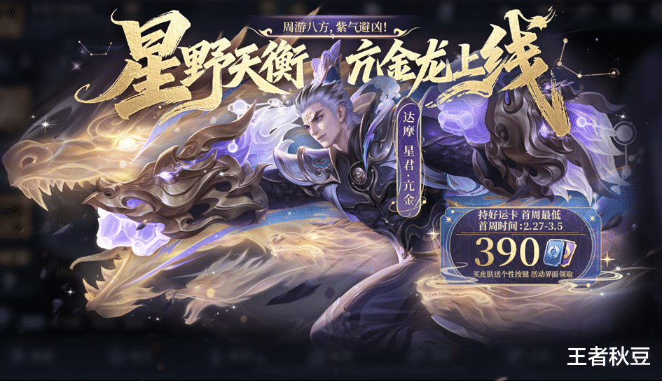 和李元芳的春节累计充值皮肤是同类型,技能特效方面整体以国风神话中的亢金星君-亢金龙为灵感,将星环、宿印和伴身金龙具象化,整体以紫色和金色为主色调。有好运卡售价最低只需要390点券,作为达摩首款史诗皮肤,值得入手。