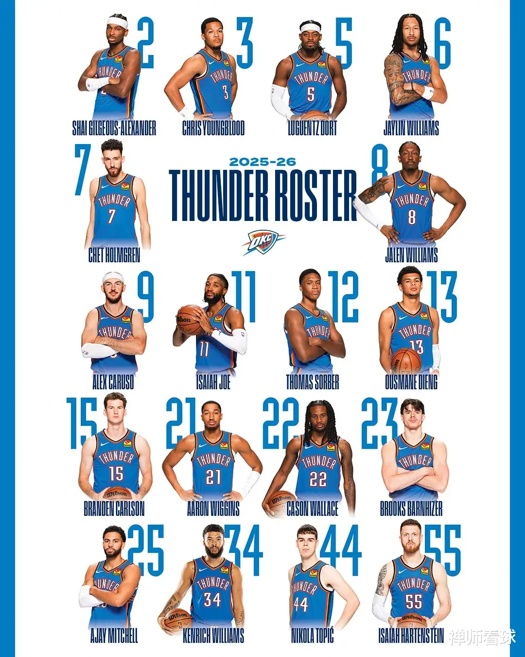 雷霆队去年夺得NBA的总冠军,今年球队以不变应万变,保留了几乎全部的冠军主力阵容,并且都是用顶薪合同锁定了未来的基石,亚历山大、杰伦威廉姆斯以及霍姆格威全部顶薪续约,而且角色球员当中,你像杰林威廉姆斯、卡鲁索以及哈滕、以塞亚乔等人也是全部签下了合同,所以今年的雷霆队阵容是非常完整,也是基本上不需要去磨合的,而且他们现在这套阵容,非常的年轻,在未来的3-5年,在联盟都是非常有竞争力的,对于雷霆来讲,就是希望能用这套阵容,能多拿下几个总冠军,他们能否做到,让我们一起来期待一下。