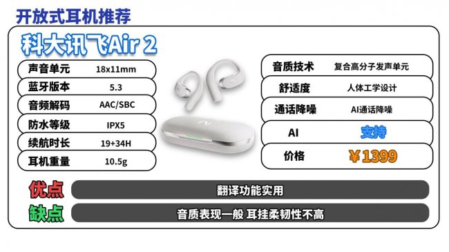 开放式耳机推荐TOP10:科大 讯飞Air 2(¥1399)