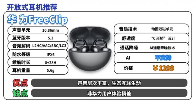 开放式耳机推荐TOP7:华 为FreeClip(¥1299)