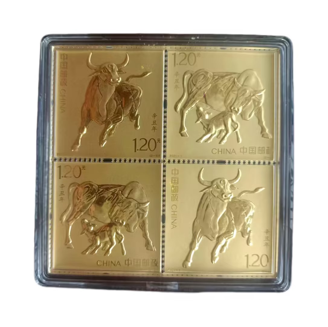 结语:方寸之间,牛转乾坤《辛丑年》邮票金(YPJ - 8)四方连,是2021年的一个文化切片,更是数千年来生肖文化的金色回响。它用黄金的永恒,定格了“孺子牛精神”的时代光芒;用金属的蚀刻,雕刻出“奋斗者”的精神肖像;用四方连的规模,汇聚成“民族意志”的集体表达。
