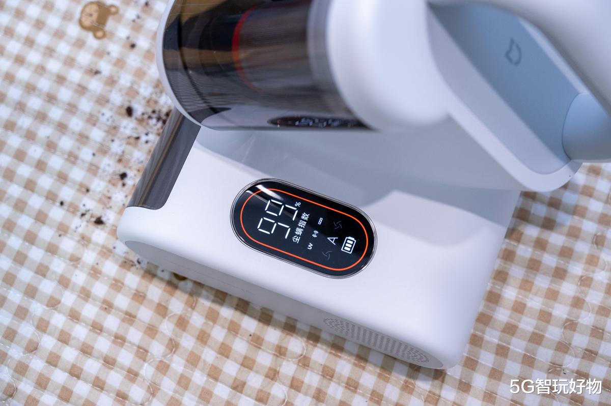 更让我惊喜的是它的智能化设计。它自带智能尘螨感应功能,能实时检测当前清洁区域的脏污程度,并且自动调节吸力大小——灰尘多的地方吸力会自动增强,干净区域则会减弱,既保证了清洁效果,又能节省电量。机身的显示屏会清晰显示当前的尘螨浓度和剩余电量,不用再靠猜测判断清洁进度,洁净状态一目了然,用起来更省心。