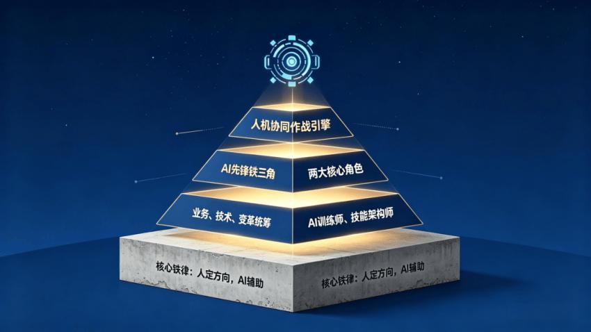 组织适配:打造人机协同的作战引擎没有适配的组织和团队,再先进的AI平台也是摆设。AI转型是一场一把手必须亲自下场的硬仗,在此基础上,还要搭出一个权责清晰、目标对齐的人机协同作战体系。