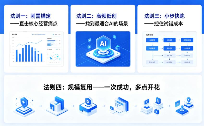 法则三:小步快跑——控住试错成本别一上来就搞要重构整个ERP系统、要打通全链路数据、周期超半年的大项目。优先选投入小、周期短、30天内能形成业务闭环的场景——单店智能排班、单品AI选品测试、单区域会员智能触达都是好选择。控住试错成本,在不断验证中积累组织的AI能力。