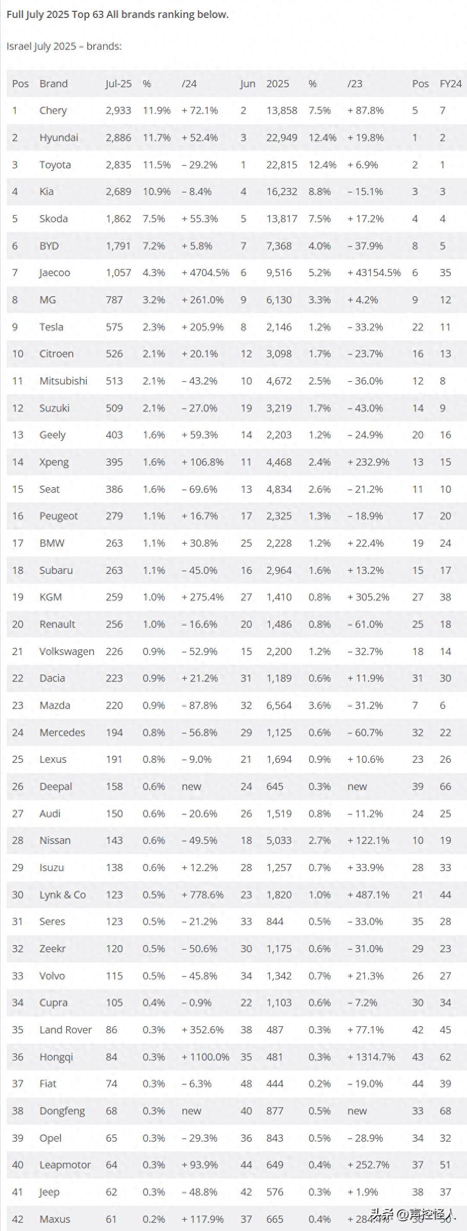 2025年7月,是奇瑞首次成为以色列月度销冠的高光时刻,也是中国品牌的第一次。本以为奇瑞在6月排名第二已是最好成绩,想不到7月就超越了现代,起亚和丰田排名第一。不过从累计销量来看,现代,丰田和起亚依然排名前三。比亚迪,杰酷和名爵排名6,7,8.中国汽车的总市占率为33.5%。