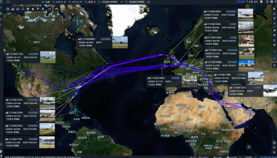"旌旗系统"在1月3日至6日下午16时,监测到美军至少有14架C-17运输机飞往欧洲,降落地点多位于以色列、英德空军基地,以及美国在相关国家的空军基地。
