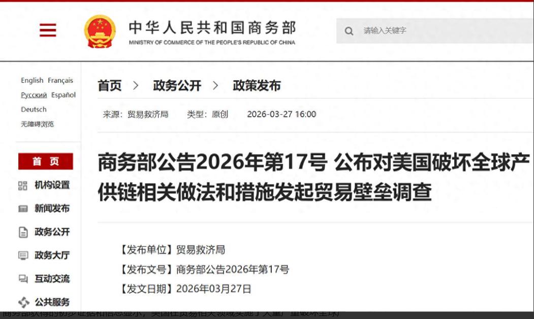 《商务部对美国启动两项贸易壁垒调查》2026-03-27 16:06·人民日报