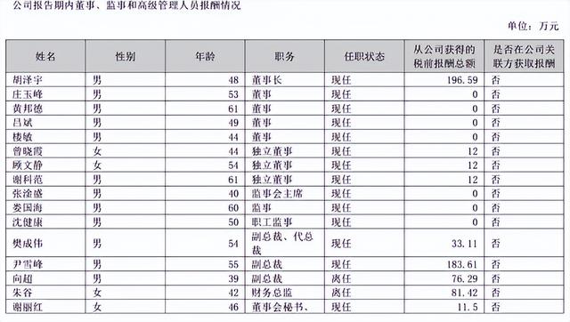 其中,董事长胡泽宇税前报酬196.59万元,副总裁尹雪峰183.61万元,两人年薪占据董监高工资近四成。此外,已离任的副总裁曹敏为126.94万元。