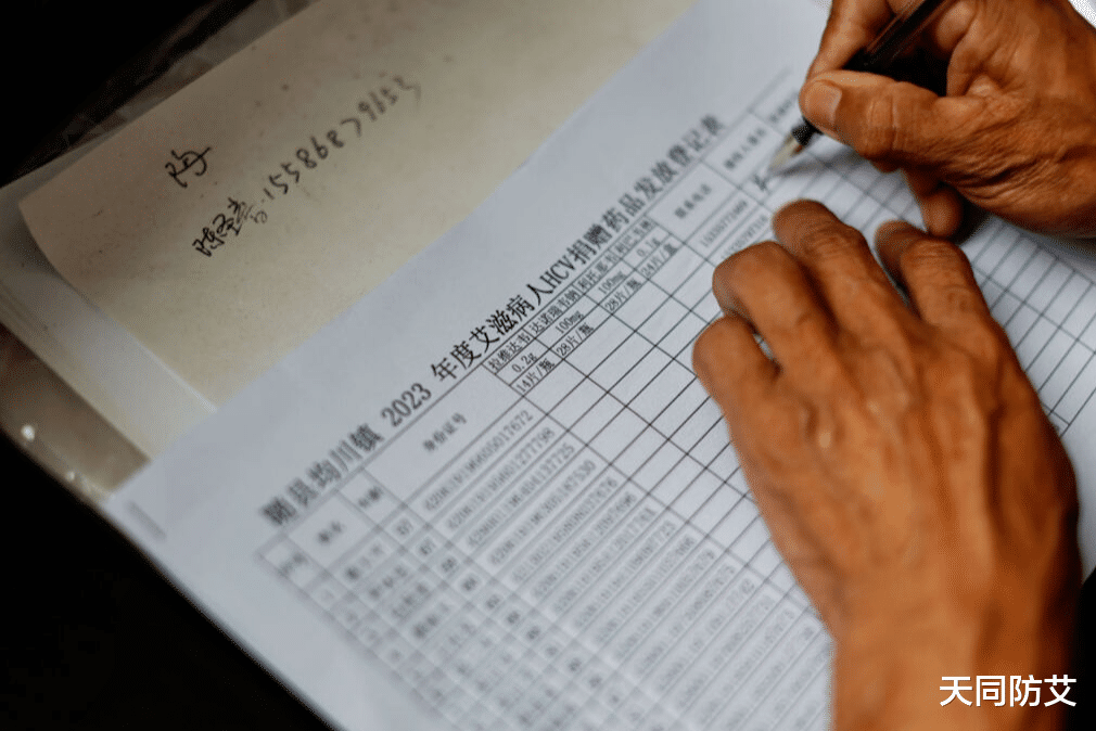 2023年,在基层艾滋病关怀点,艾滋病感染者在填写领取药品登记信息。张赫摄