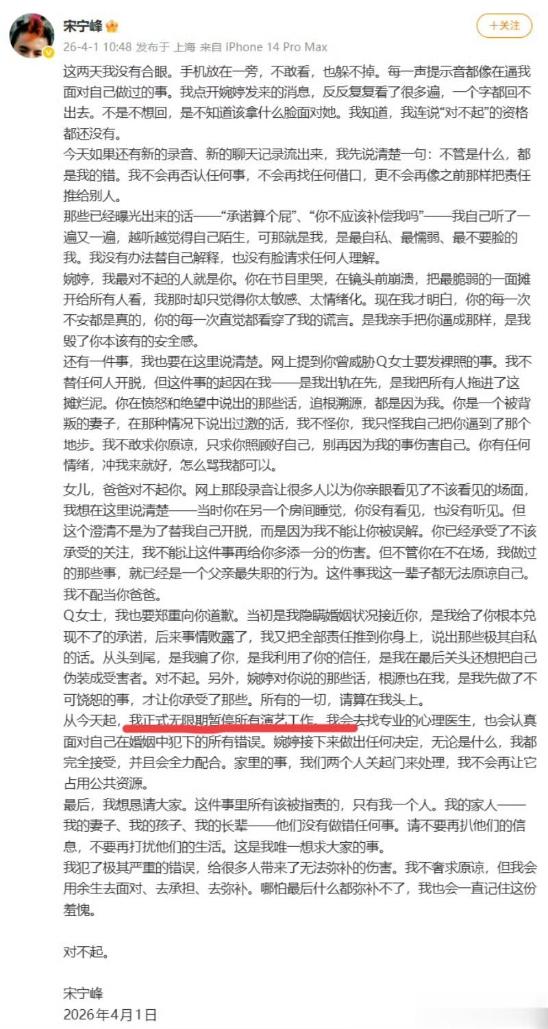 直到舆论彻底失控,他才发布长文道歉,承认出轨事实,宣布无限期暂停演艺工作,把所有责任揽到自己身上,可一句轻飘飘的道歉,早已弥补不了对两个女人、两个孩子的伤害。