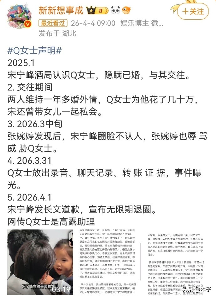 时间拉回3月31日,圈外Q女士主动放出7分48秒录音与海量聊天记录,将宋宁峰持续15个月的婚内出轨彻底公之于众。