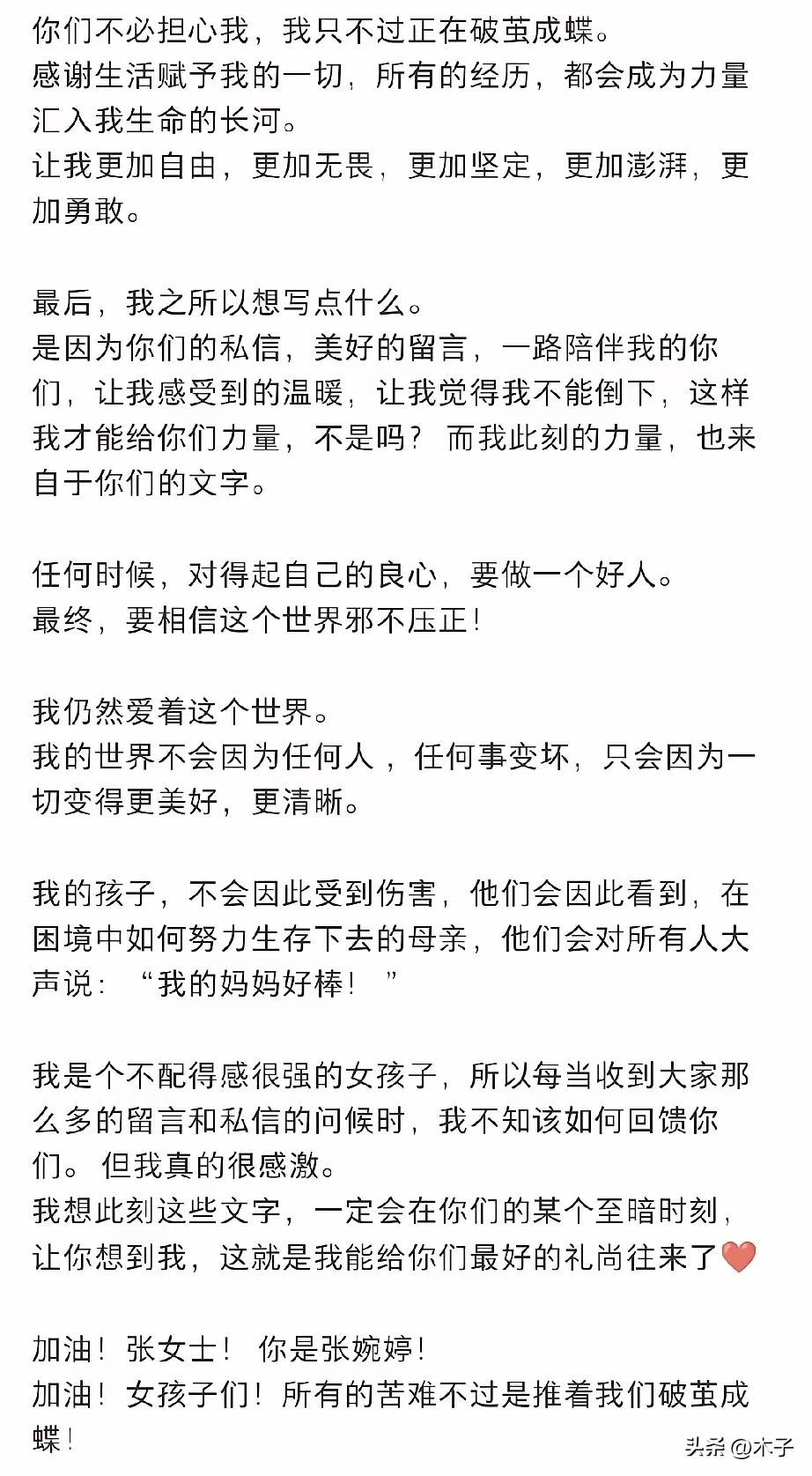 4月11日,宋宁峰出轨风波发酵11天后,张婉婷终于在社交平台发布千字长文首度正式回应,一句“所有的苦难不过是推着我们破茧成蝶,不必担心我”,瞬间把#张婉婷回应离婚# 推上了热搜。