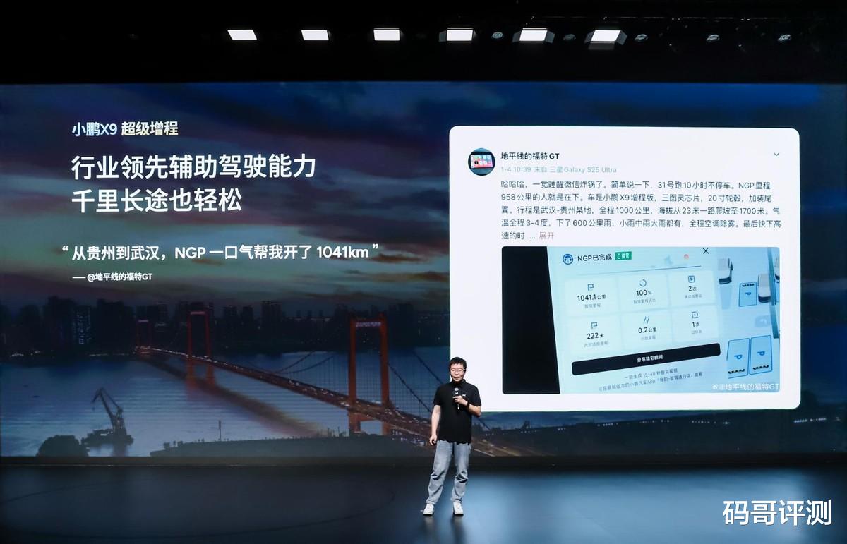 小鹏 X9 超级增程行业第一梯队的辅助驾驶能力,赢得用户高度青睐。拥有2250 TOPS顶级算力,可实现从高速到城区的全场景辅助驾驶覆盖,将驾驶者从疲劳中解放。强大算力更支撑VLM私人管家和全场景VLA功能,让车机系统更智能、更人性化。用户实测小鹏X9超级增程从贵州到武汉1041km一口气直达,未补能未接管。