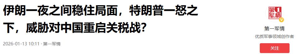 参考来源:伊朗一夜之间稳住局面,特朗普一怒之下,威胁对中国重启关税战?——2026-01-13 10:11·第一军情