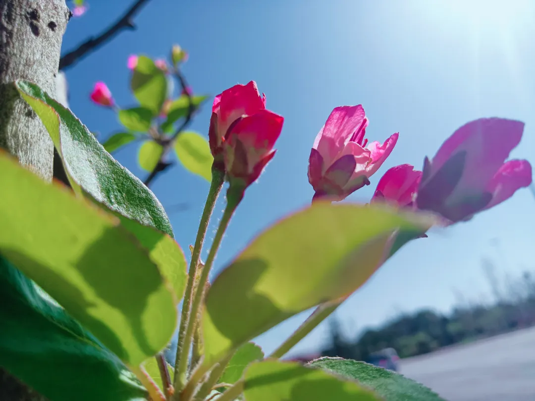 海棠花初绽,在路边,在公园里,在护城河边。阳光下,粉嫩粉嫩,三三两两的开在一起,有的含苞,有的初开,还有的才是骨朵儿。风儿吹来,一树温柔。