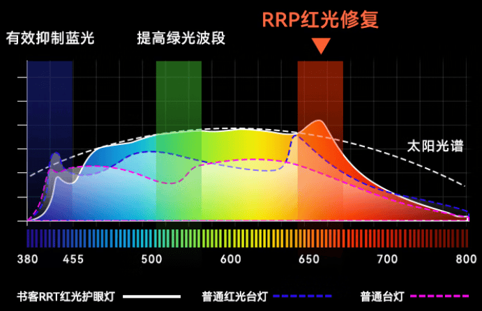 ▲书客台灯L1采用RRT红光养眼技术,可重点控制自然光谱中有害的蓝光波段,避免过量,同时增强有益红光波段,光谱连续(红、绿、蓝等波段比例合理),更接近自然的太阳光谱,让眼睛在长时间使用中不易干涩,尤其适合学习、办公等高频用眼场景。
