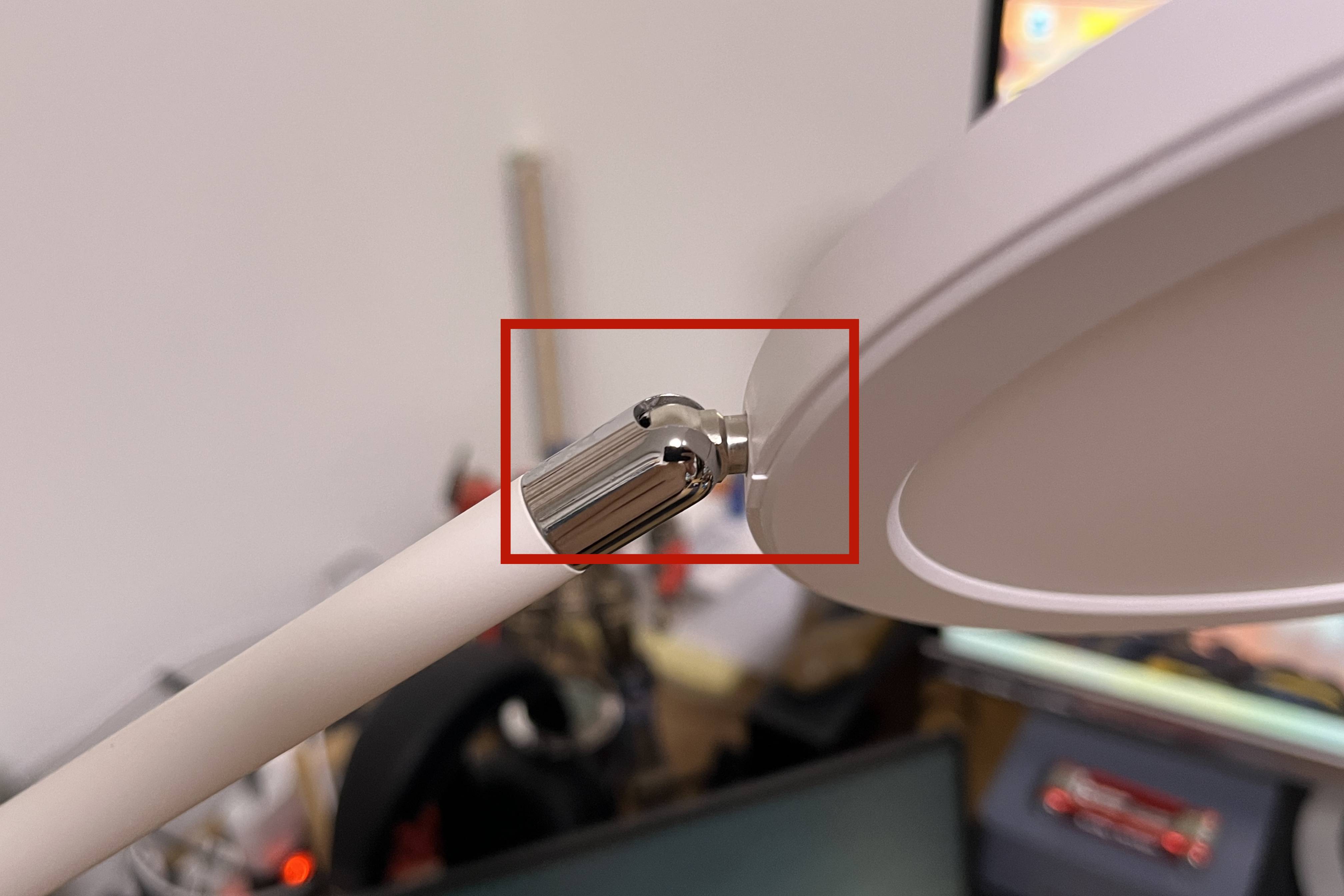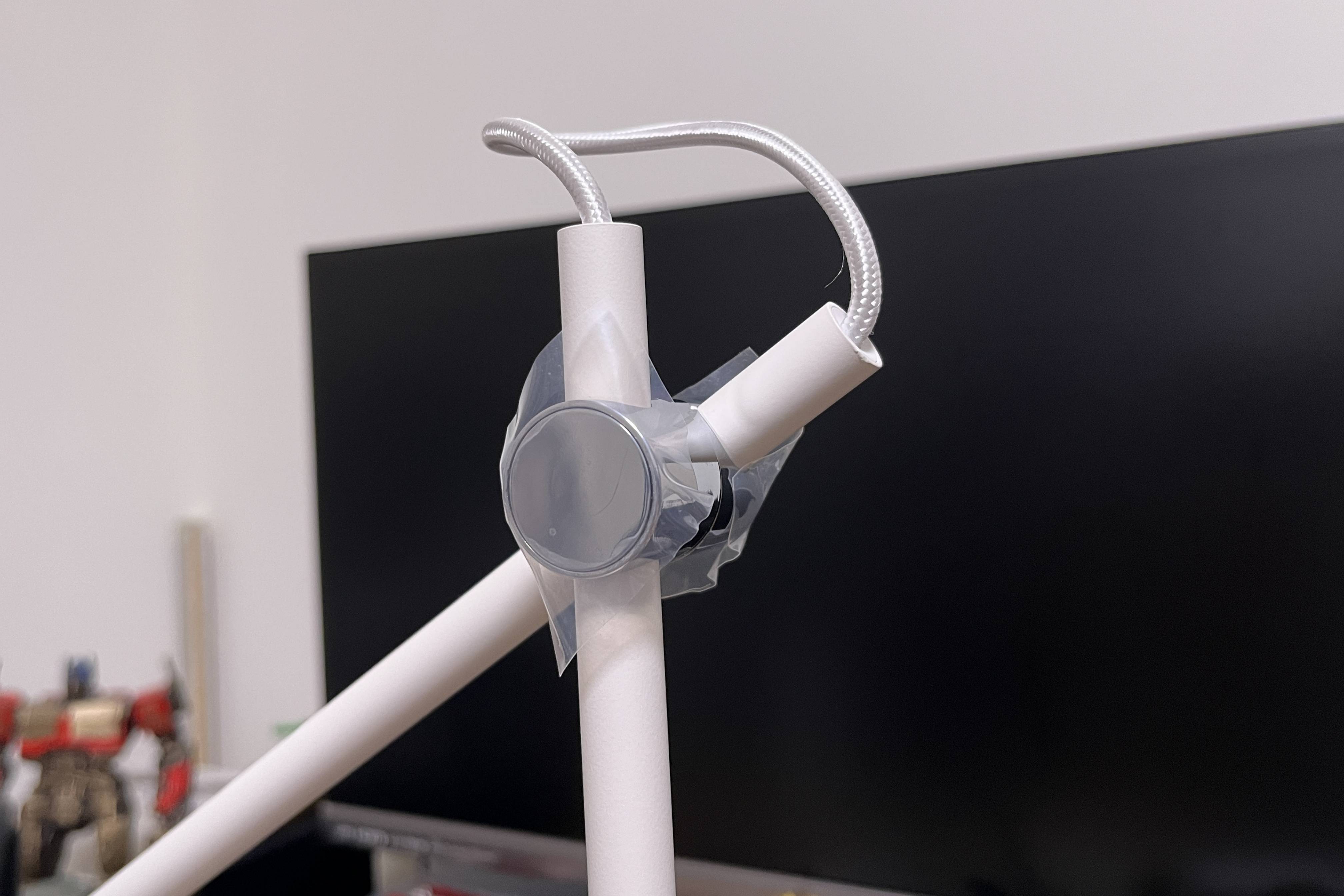 ▲在台灯的可调节部分采用了金属件亮面镀铬工艺,并贴有无胶透明保护膜(正式使用后可去除),裸露部分的电源线采用白色编织线。