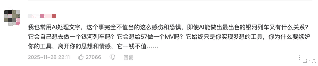 前段时间,在知名UP主“影视飓风”的作品中,这个口号再一次刷屏。该UP的作品是在探讨AI和人的矛盾这个话题,探讨围绕他们帮助一个民间摇滚乐队制作歌曲MV展开,因为歌名是《银河列车》,所以MV的制作核心自然也是列车。