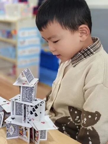 扑克牌薄薄一张,如何能搭起高高的城堡?这背后藏着孩子们对空间结构与力学平衡的懵懂探索: