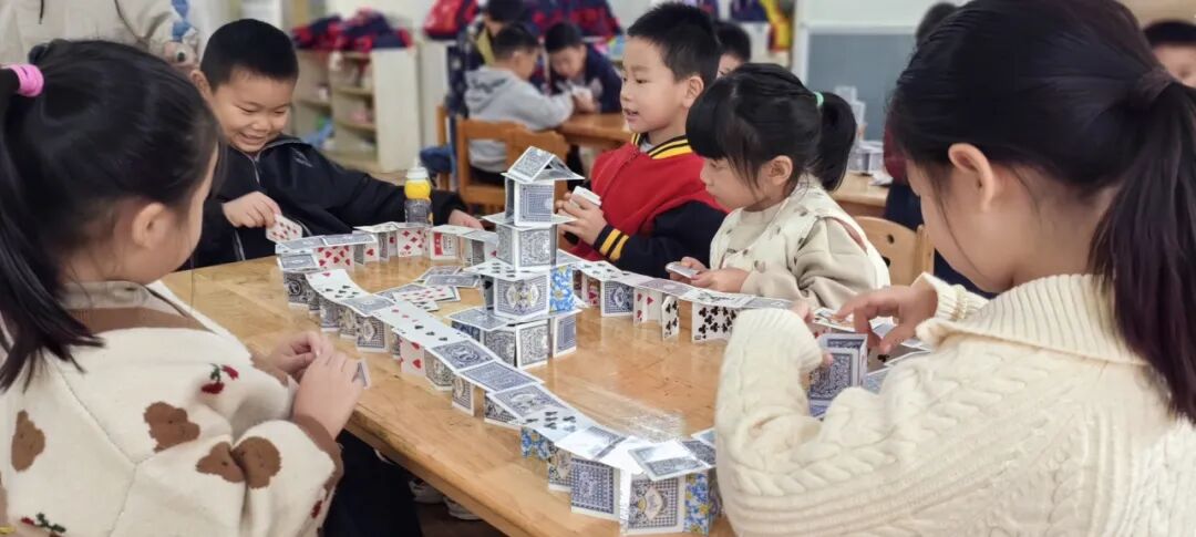 这场扑克牌搭建游戏,不仅是一次 “玩” 的体验,更是幼儿园“游戏化教学”的生动实践:老师以观察者、引导者的身份,支持孩子们的每一次探索 —— 当孩子为 “城堡倒塌” 皱眉时,老师会问 “你觉得哪里可以改进呢?”;当团队出现分歧时,老师会引导 “试试听听小伙伴的想法吧”…… 在 “科学 + 趣味” 的双重驱动下,孩子们收获的不仅是搭建技能,更是主动探索、解决问题、合作分享的核心素养。