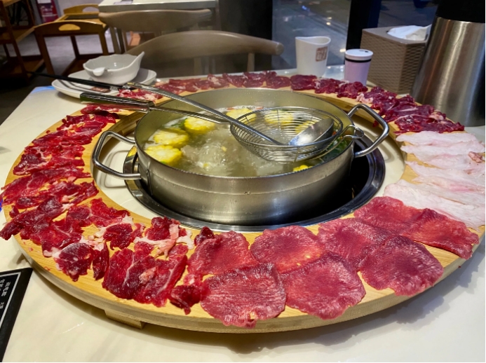 更讲究的是切割工艺。一头牛身上有40多个部位,每个部位的肉质特点不同,切割方式也大相径庭:吊龙肉要顺纹切薄片,保证涮煮时的嫩度;雪花肉需斜切,让脂肪分布更均匀;牛筋丸则要手工捶打上千次,才能打出Q弹的口感。