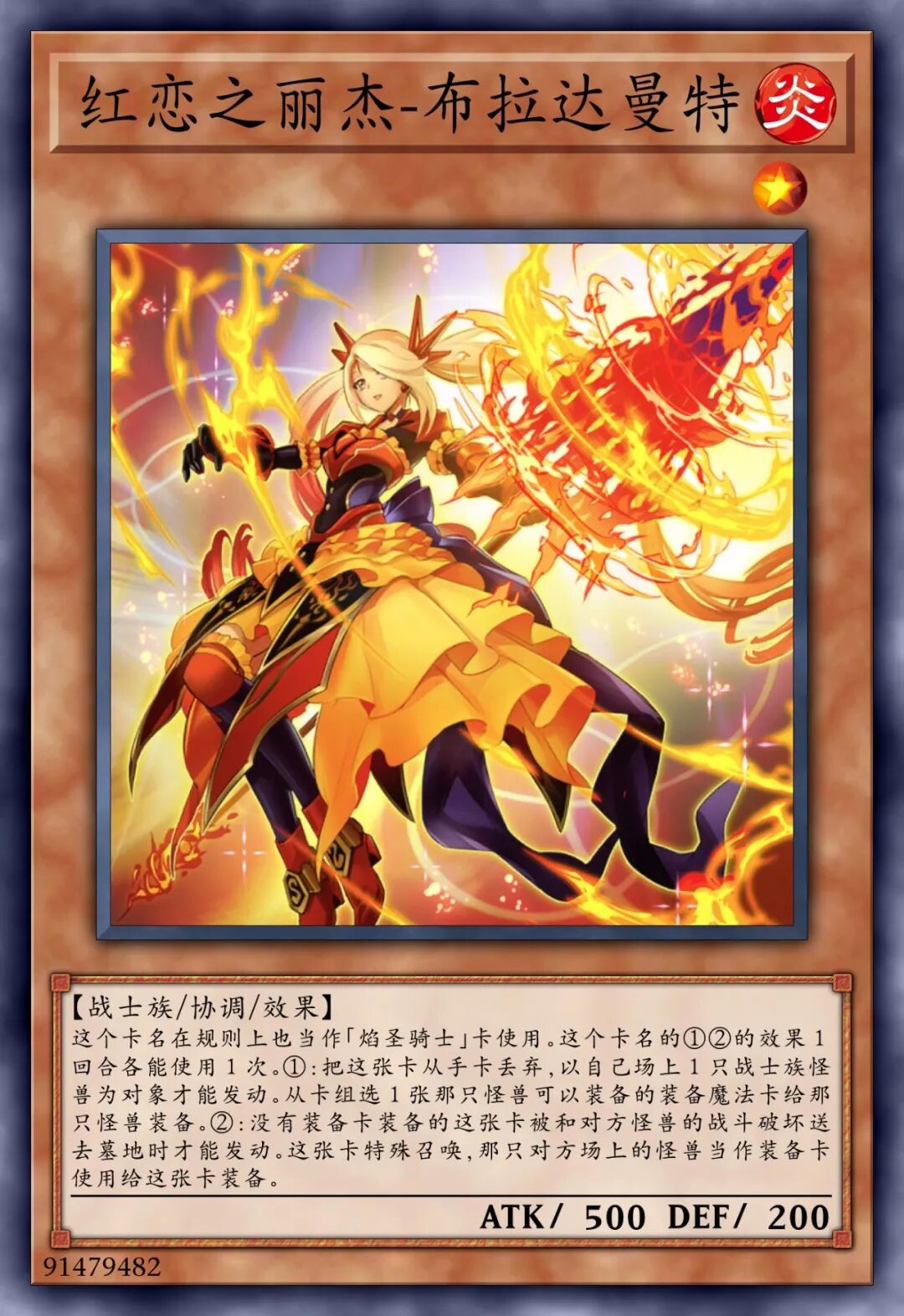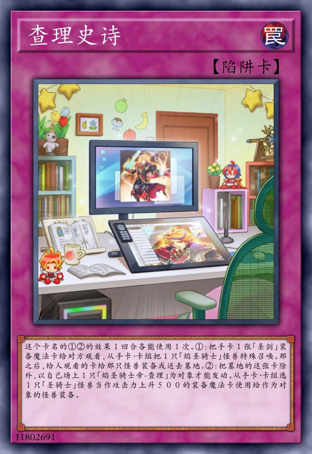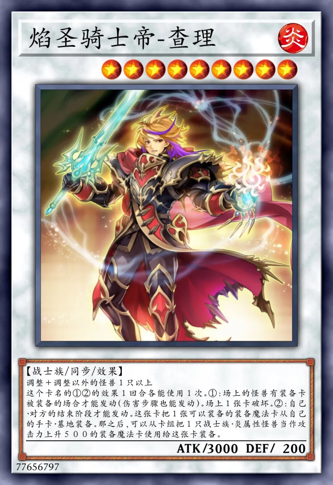 ①:这张卡连接召唤的场合,以我方墓地1只「焰圣骑士帝-查理」为对象才可以发动。这张卡当作和那张卡同名卡使用,得到相同效果。那之后,作为对象的怪兽当作攻击力上升500点的装备魔法卡使用给这张卡装备。②:1回合1次,魔法•陷阱卡的效果发动时,从我方的手卡•场上(表侧表示)将1张装备魔法卡送去墓地才可以发动。那个发动无效并破坏。