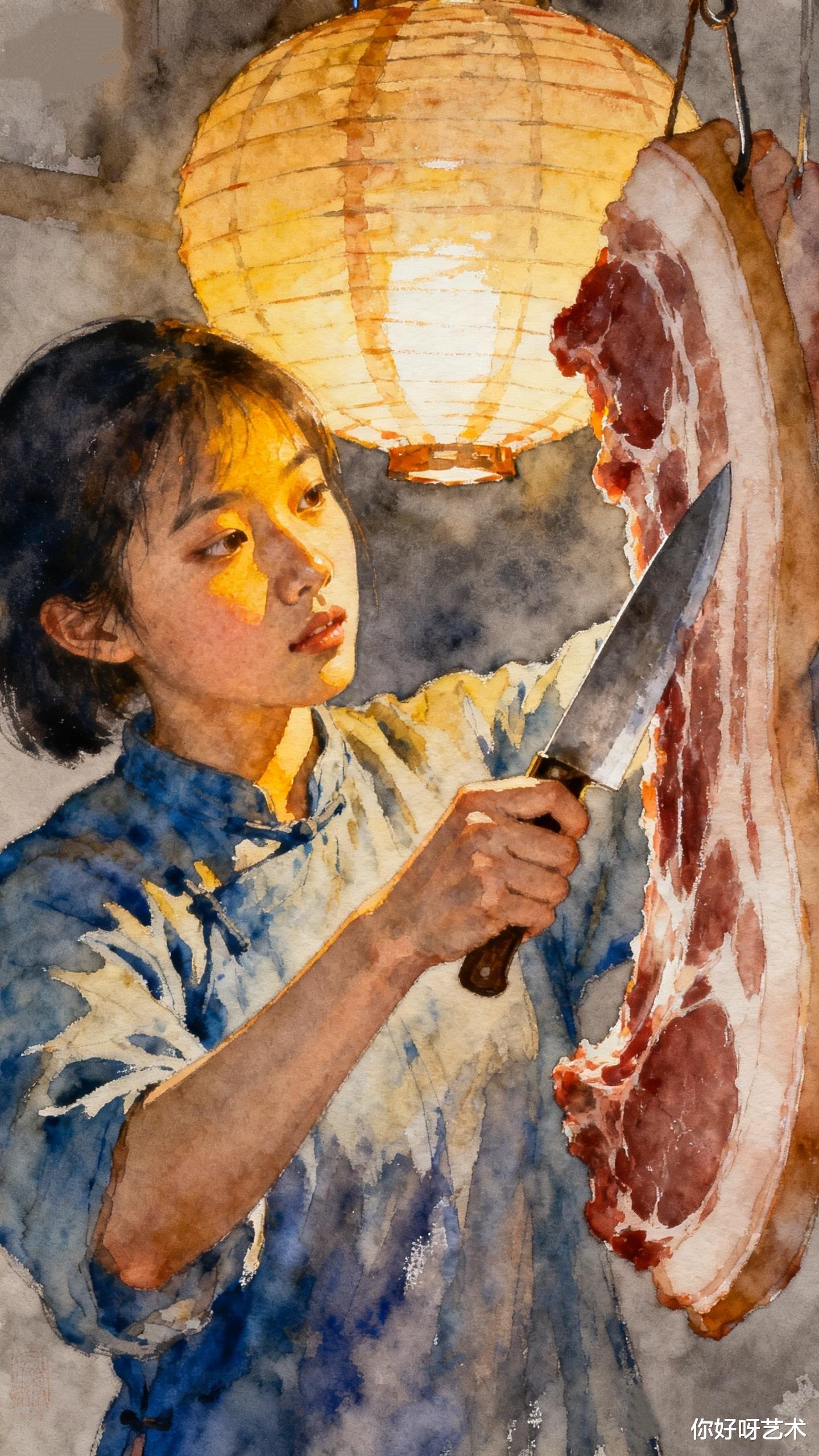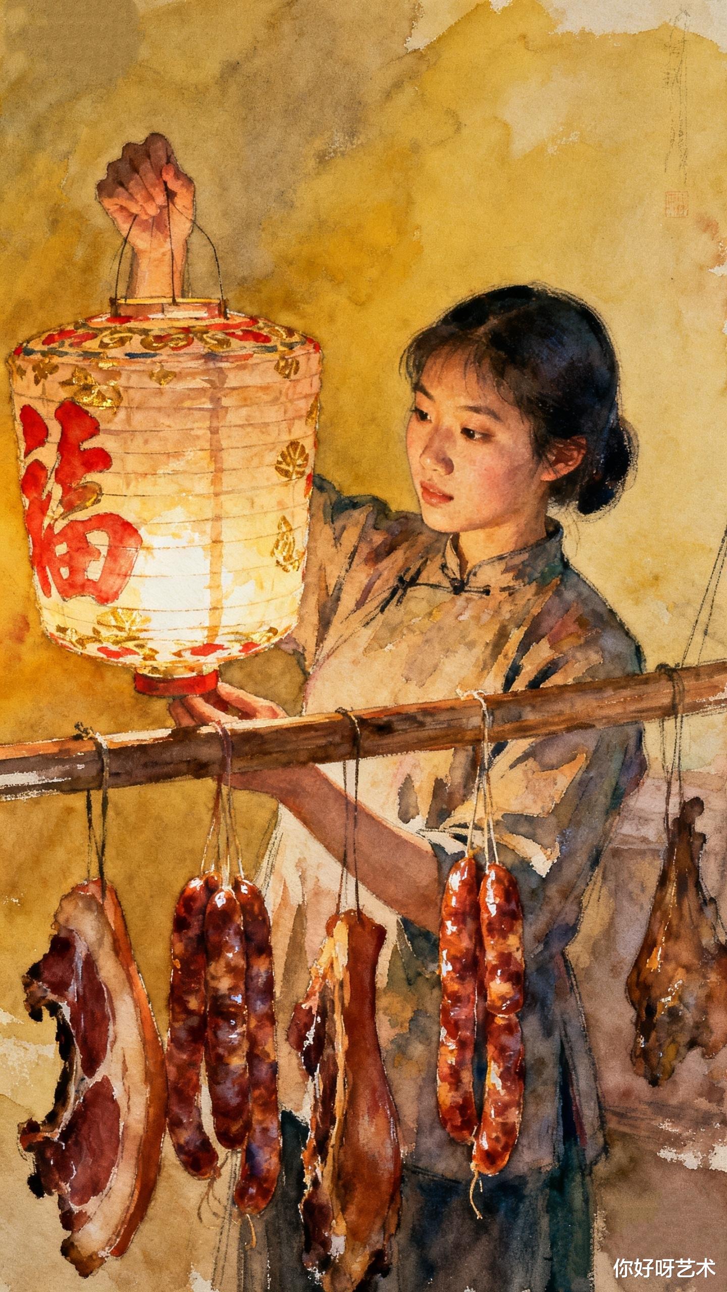 暮色漫上来,院坝里的灯亮了,暖黄的光裹着满院的热闹,灶火还在温着汤,案头的水彩画也凝了色,大铁锅、满桌的菜、飘着的汽雾,都绘在素笺上,藏着杀猪饭的鲜,藏着乡邻的暖,藏着腊月二十六独有的年俗味。少女咬一口刚炒的回锅肉,肉香在舌尖化开,抬眼望向纸上的画,眉眼弯弯——原来最浓的年意,从不在精致的笔墨里,而在这烟火缭绕的杀猪宴里,在这彩笺煮暖的热闹里,在人间烟火的相聚欢喜里。