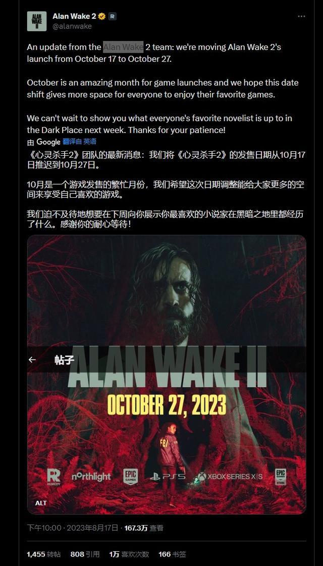 “来自《心灵杀手2》团队的一则更新:我们将《心灵杀手2》的发售日期从10月17日推迟到10月27日。10月是一个令人惊叹的游戏发售月,我们希望这个日期调整能给大家更多的空间来享受他们最喜欢的游戏。我们迫不及待地想在下周向你们展示每个人最喜欢的小说家在黑暗之地里都做了些什么。感谢你们的耐心!”