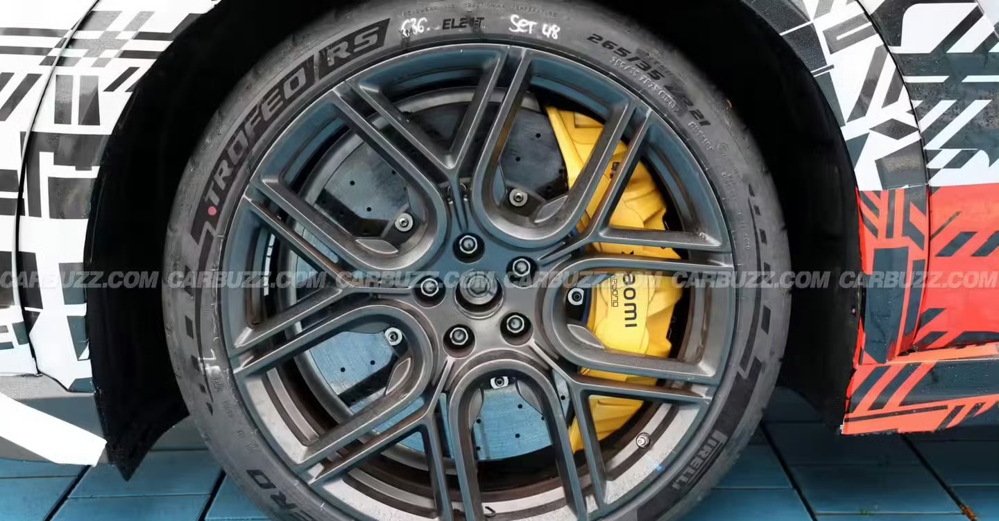 从这辆小米YU7的轮胎以及刹车盘上也可以看出这是一个高性能版本车型,这个刹车盘的尺寸非常的大,几乎已经塞满了整个轮胎。
