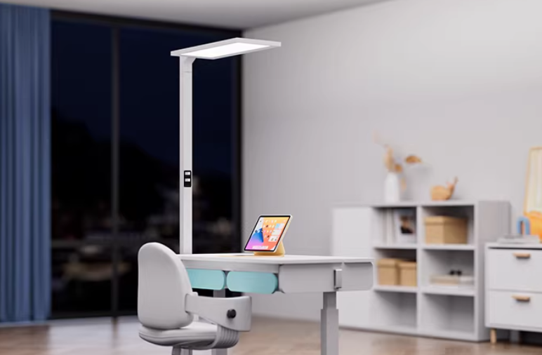 这款灯专门为儿童学习设计的专为亲子学习场景设计,核心亮点是0眩光光栅盾技术,通过23片不等间距遮光格栅打造50°超大遮光角,UGR<10,孩子直视灯体也不刺 眼,是唯一获CQC5A认证的大路灯。桌面平均照度1400lux,上下光源采用13:1黄金配比,可均匀覆盖25㎡空间,无明暗差。全光谱技术补足有益紫光,Ra≥95,色彩逼真,经实验验证可减少4.3倍眼疲劳、提升3.2倍学习效率。支持3300K-5300K色温调节与四大智能模式,弯腰38.5°设计让灯头始终对准桌面中心,减少阴影,适合有儿童、注重亲子共读的家庭。