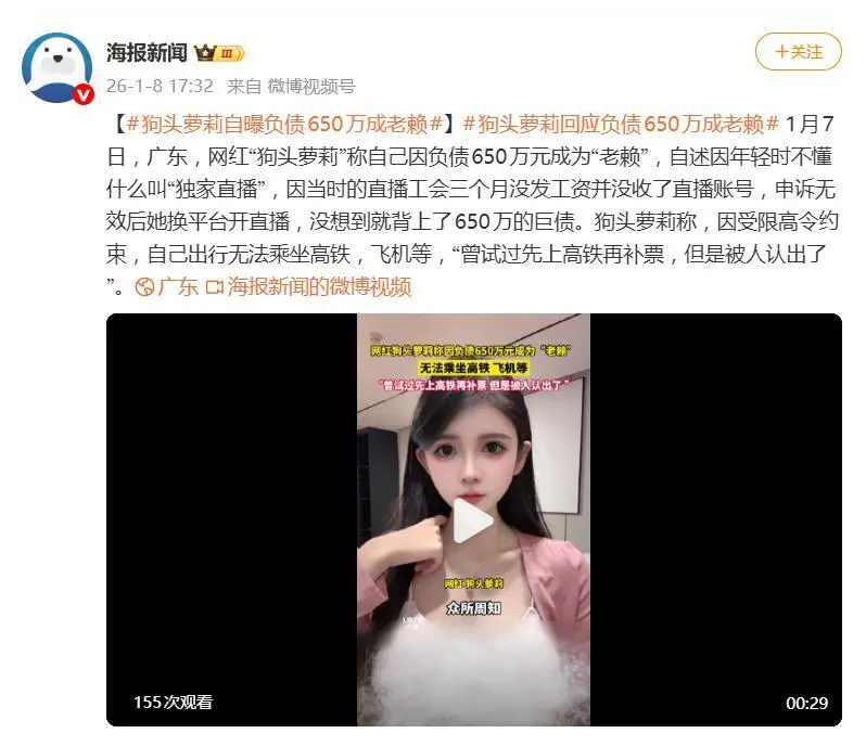1月8日,二次元网红狗头萝莉(本名夏凯旋)发布视频自曝近况,坦言已因650万巨额债务被列为失信被执行人(俗称“老赖”),出行受限的她为跨城摆摊曾尝试先上高铁再补票,却因网红身份被同车乘客认出举报,计划当场泡汤。