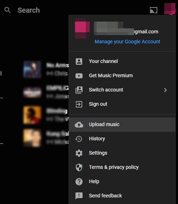 步骤二:点击 YouTube Music 界面上的个人资料图标,找到“上传音乐”部分。然后,您可以从电脑中选择音乐文件,并将其拖放到指定的上传区域。