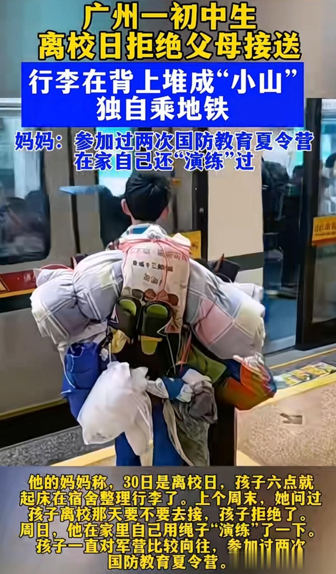 据孩子家里人解释,当日的离校日,他拒绝家中父母的接送提议,坚持独自打包所有的住校生活用品回家。